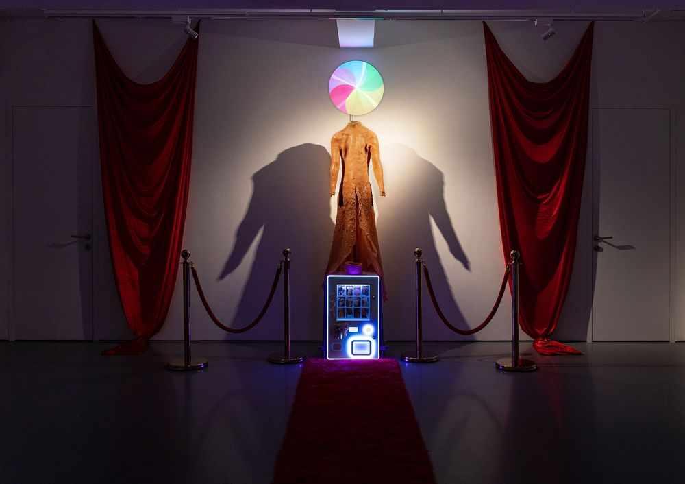 At the end of a long red carpet, The Creator 2.0 (2024) awaits. As if an altar built in commemoration of The Arcana Intelligent, the interactive installation is composed of a headless, solitary figure stood atop a luminous card vending machine. Upon inserting a token, visitors will receive a card at random, each with an image that is AI-generated from the same set of found photographs used in Open Yourselves (Ourselves). Printed on holographic cardstock in reference to celebrity trading cards, the distorted representations of the male body not only allude to the glorification of certain body builds but are also reflective of the dysmorphia caused by canonical definitions of beauty. Imposing a physical ritual on its participants, the novelty of the installation materializes the aspects of objectification and gratification that are normalized in online dating culture.